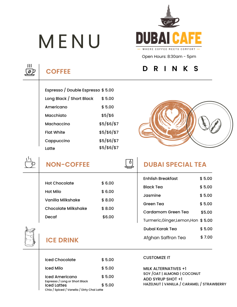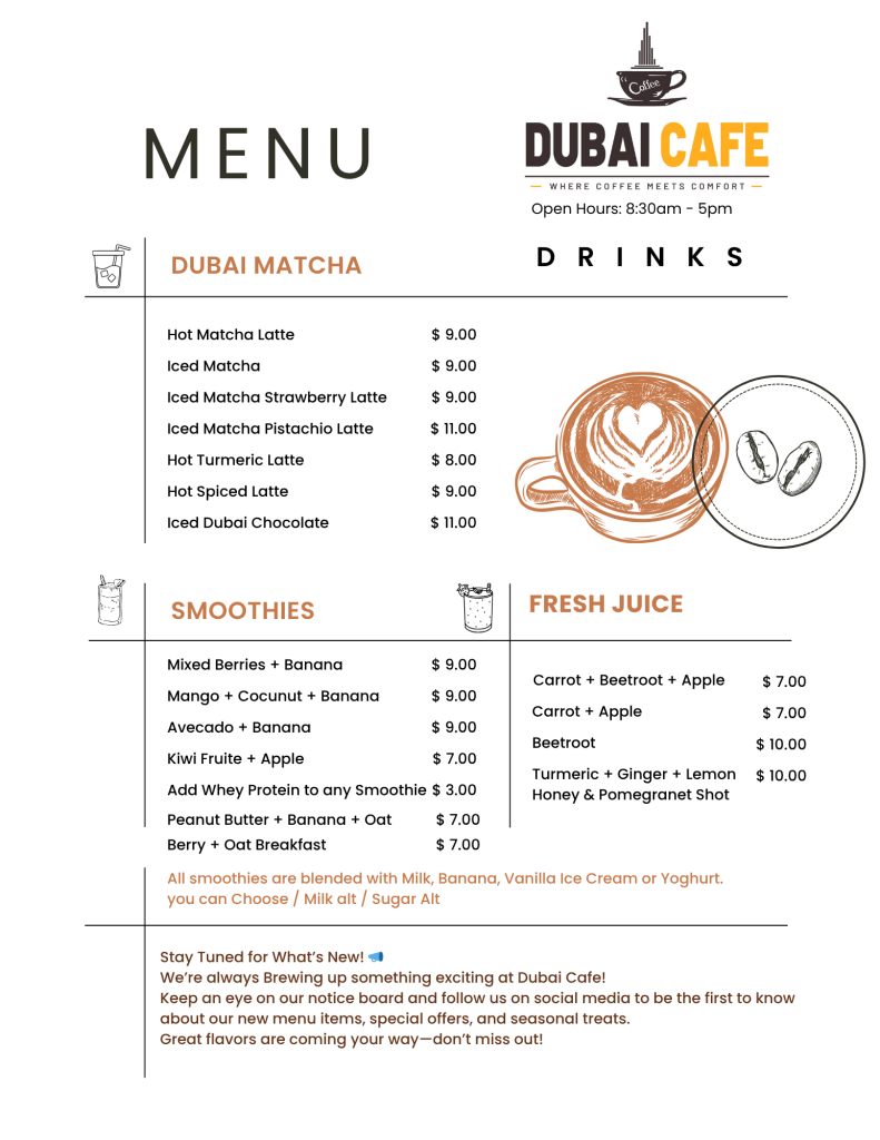 Our menu is a celebration of Afghan hospitality and tradition, featuring slow-cooked meats, fragrant rice dishes, handmade bread, and a range of fresh, flavorful dishes prepared with authentic spices and recipes passed down through generations. Paired with the warm, elegant ambiance inspired by Dubai’s world-class café scene, we’ve created a space where guests can relax, connect, and experience something truly special.